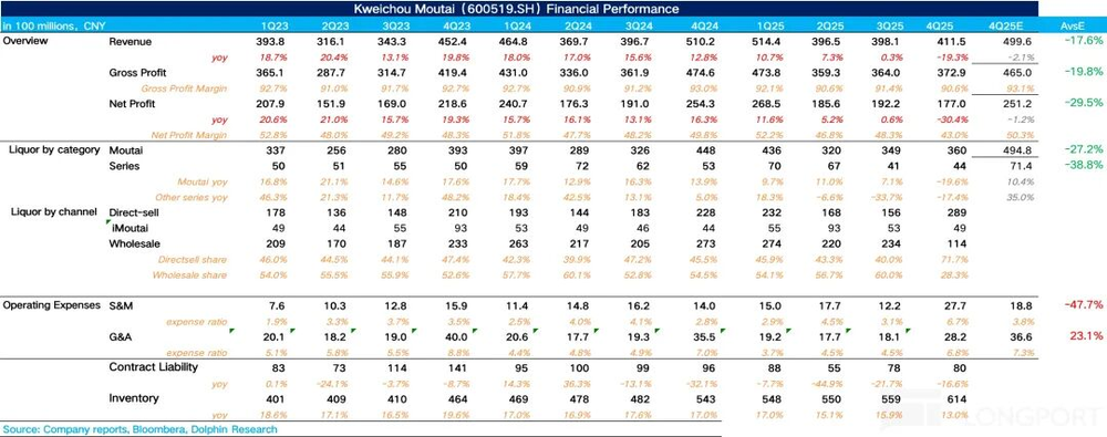 4Q25茅台酒实现营收360亿元,同比下降20%,全年维度下降10%。