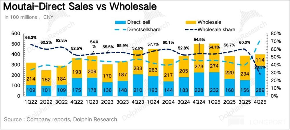 从渠道结构来看,4Q25茅台直营渠道实现营收289亿元,同比增长27%,占比阶段性拉高到72%。在i茅台几乎不贡献收入的情况下(i茅台内部改革)海豚君推测茅台把部分原本流向批发渠道的配额投向了企业团购、线下自营体验店等直营渠道。批发渠道实现营收114亿元,同比下降58%。