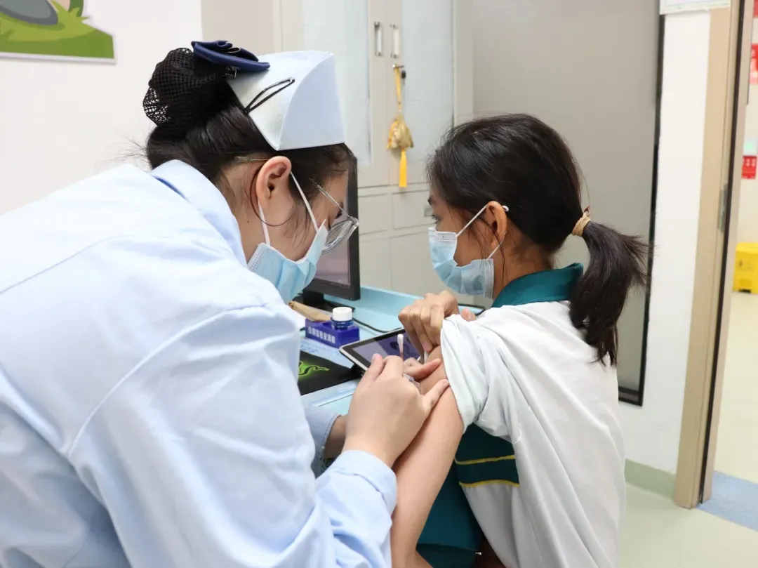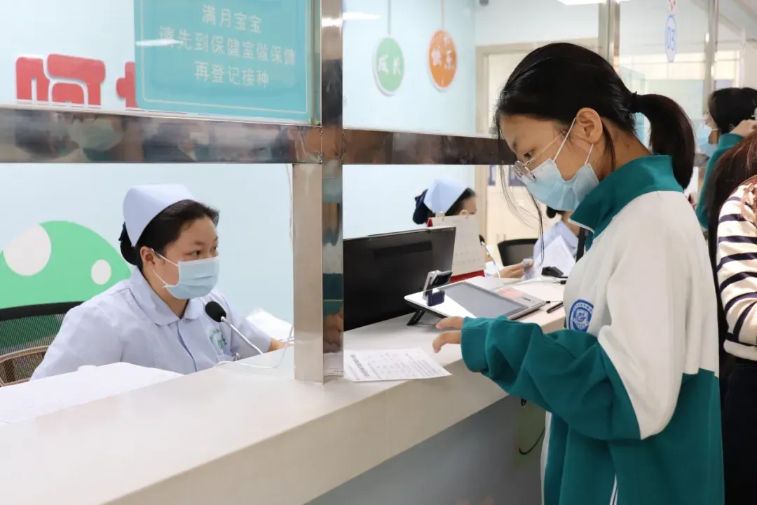在区社区卫生服务中心二楼预防接种门诊,医护人员为前来接种的学生全程提供暖心服务,细致讲解HPV疫苗的防控作用、接种流程及后续注意事项,帮助学生和家长全面了解接种相关知识,消除顾虑。